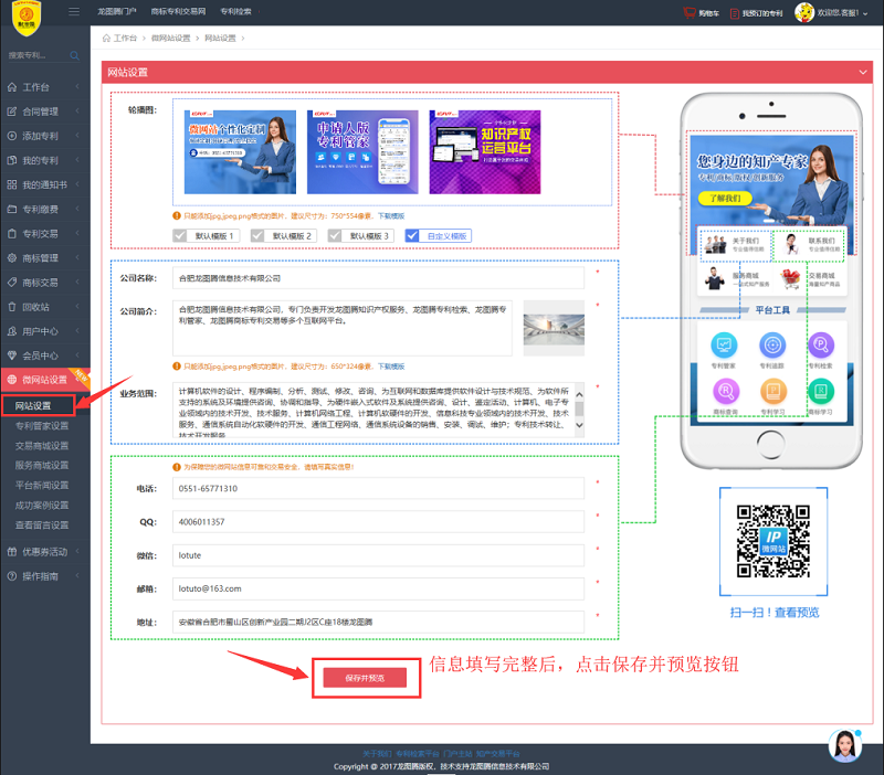 2. 填写正确信息后,点击页面底部的保存并预览按钮。可以生成微网站二维码和微网站链接。(二维码可以直接用手机扫描查看,链接可以绑定到微信公众号,或者直接在手机浏览器查看。)