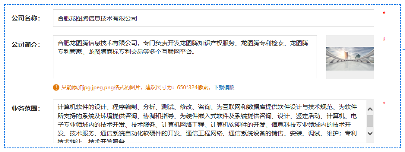 B.填写公司信息:填写公司名称、公司简介、业务范围。公司信息均为必填项。如下图: