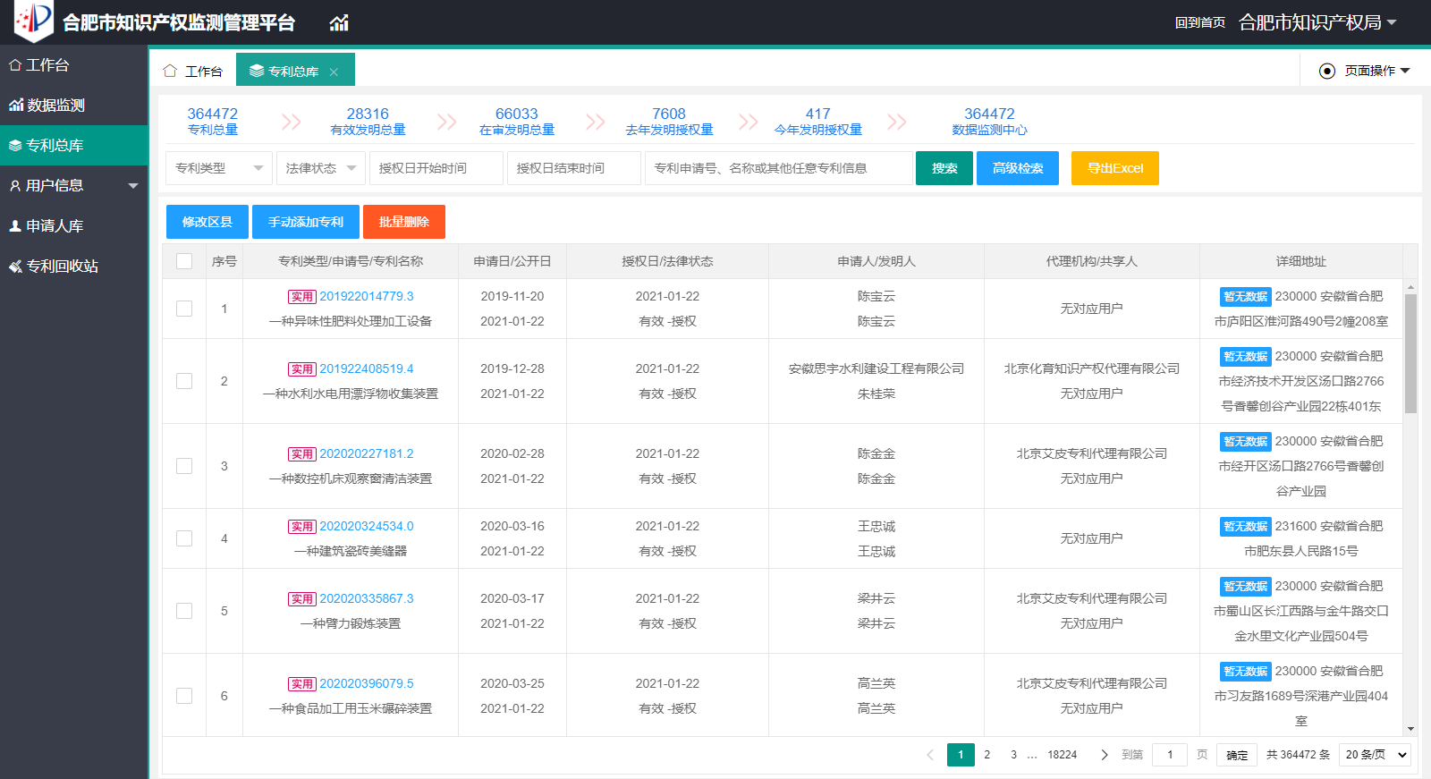 二、专利库 专利库包含本区域的所有专利数据,方便快捷管理,有效统计各种类型专利数据,可以将专利直接推送给对应申请人,大大提高专利管理效率。