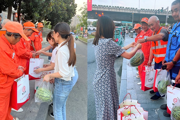 买专利卖专利找龙图腾,真高效! 查专利查商标用IPTOP,全免费!专利年费监控用IP管家,真方便! 七月以来,炎炎夏日,持续高温,让人酷暑难当。当大家都躲进空调屋纳凉时,我们的城市美容师——环卫工人却头顶烈日,在道路上与高温高湿“战斗”,用辛勤汗水换来城市的清净整洁。7月22日傍晚,龙图腾人事部的小伙伴们来到了蜀山区大铺头,用实际行动为高温下的劳动者送去缕缕清凉。