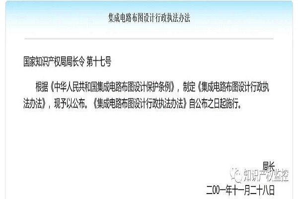 五、立法情况 我国《集成电路布图设计保护条例》于2001年3月28日国务院第36次常务会议通过,自2001年10月1日起施行。根据《集成电路布图设计保护条例》制定的《集成电路布图设计保护条例实施细则》,自2001年10月1日起施行。根据《集成电路布图设计保护条例》,制定的《集成电路布图设计行政执法办法》,现予以公布。《集成电路布图设计行政执法办法》自2001年11月28日起施行。